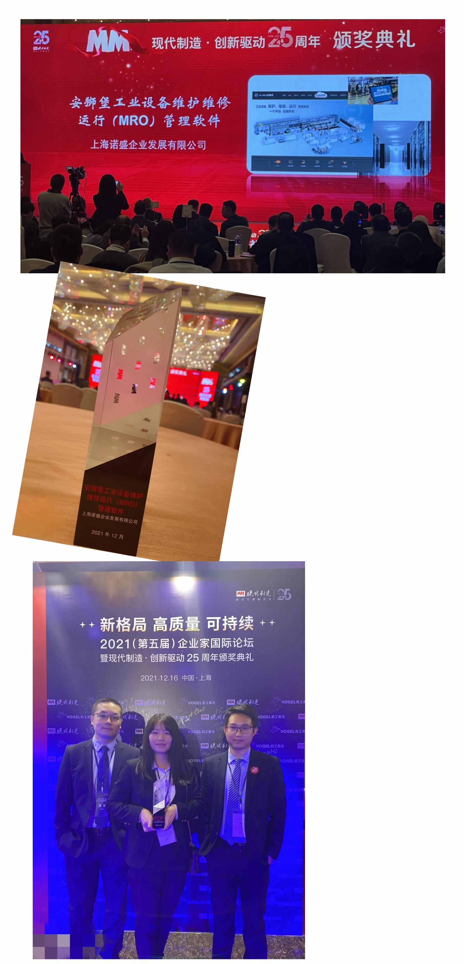 On December 16, 2021, the?Fifth Entrepreneur International Forum and the 25th Anniversary Award Ceremony of Modern Manufacturing?Innovation Driven by MM "Modern Manufacturing" was held in?Shanghai, ns-Box Industrial Equipment?MRO?Management Software made its debut at the awards ceremony and won the 2021 Smart Solution Award. James Yang, General Manager of MRO Division, Judy Hu, Marketing Manager?and Steven Beng,?Operation Director?were invited to attend the award ceremony. ns-Box?software adheres to the company's consistent innovative and pragmatic spirit, steadily innovates?in the field of equipment MRO management software in advanced manufacturing, and continues to create new digitalized?high-tech intelligence.